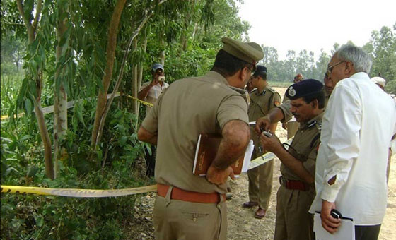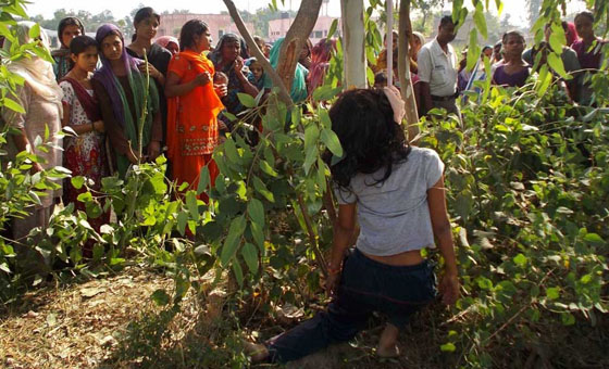 当地时间2014年6月12日,印度莫拉达巴德,民众围观被吊在树上的女性尸体。据悉当地一名19岁的女孩遭到强奸后被谋杀并悬挂树上。日前一对印度姐妹惨遭轮奸,被杀后尸体悬挂芒果树。