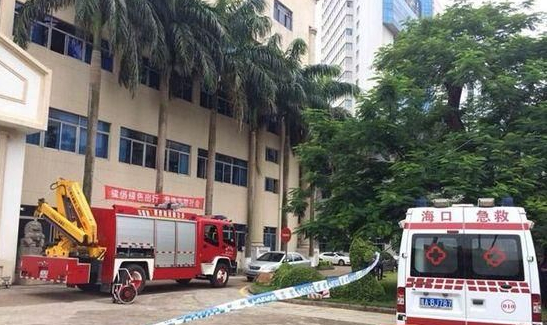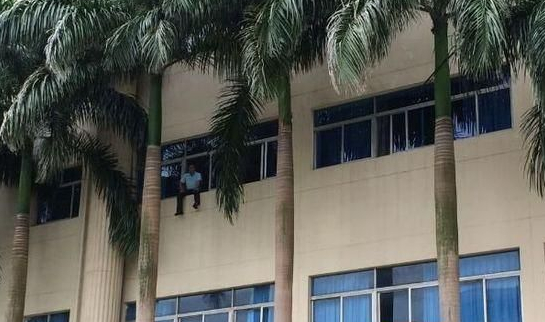 南海网海口6月13日消息 今天上午10点左右,在金盘某通信公司办公楼三楼,一男子爬上窗口欲跳楼,并在微博上直播自己将要跳楼。截止目前,公安,消防,救护车辆都已经在现场。