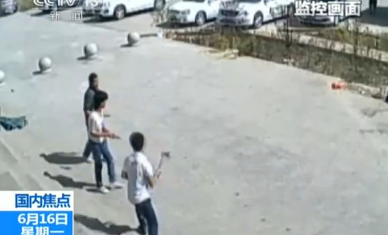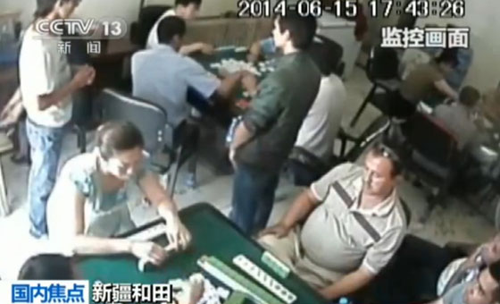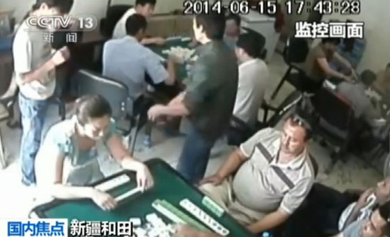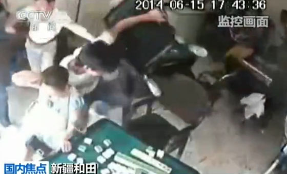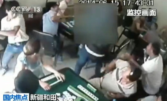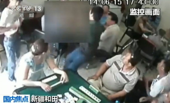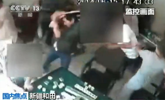 主持人:昨天下午5点45分左右,三名手持斧头的歹徒冲入了新疆和田市迎宾路的一家棋牌室,对室内的群众进行砍杀。80秒之后,他们被闻讯赶来的武装巡逻力量和群众们彻底制伏。
