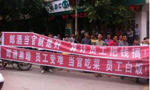 6月16日晨8时,郎酒集团位于四川古蔺二郎镇生产总部近千名员工罢工。工人拉着横幅声讨郎酒集团对工人的不公平待遇,据当事人介绍,罢工一直持续到当晚10时许。