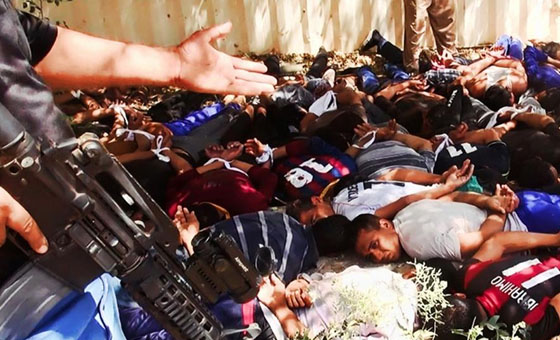极端分子羞辱这些被俘的政府军士兵。这些政府军士兵可能是在逃跑过程中,换上了平民服装。面对极端组织的攻势,伊拉克政府军可谓一触即溃,在战场上,800名反政府武装竟能让伊拉克政府军两个师约3万人落荒而逃。