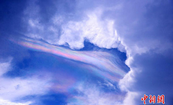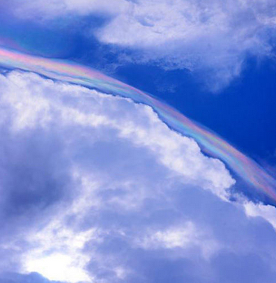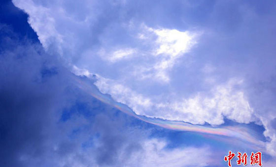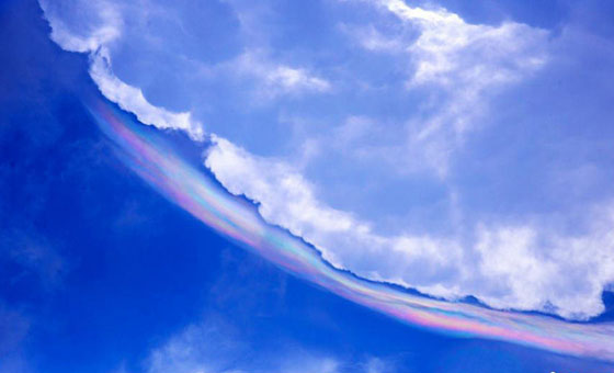 6月18日下午,福建平潭上空出现了一条带状的“彩虹云”。它依附在白色云团旁边,有红、黄、蓝、绿、紫等颜色,经阳光照耀,光艳四射,类似彩虹,在蓝天白云的衬托下仿佛一幅美丽的油画。对此,当地气象部门有关人员解释说:“必须要云朵中的水珠大小均等才能产生出这种云彩,这属于比较罕见的自然现象,看到彩虹云的确需要好运气,因为它真的不太常见。”蔡起辉摄