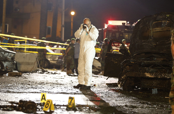 6月24日,一名工作人员在黎巴嫩首都贝鲁特南郊的自杀式汽车炸弹袭击现场拍照。