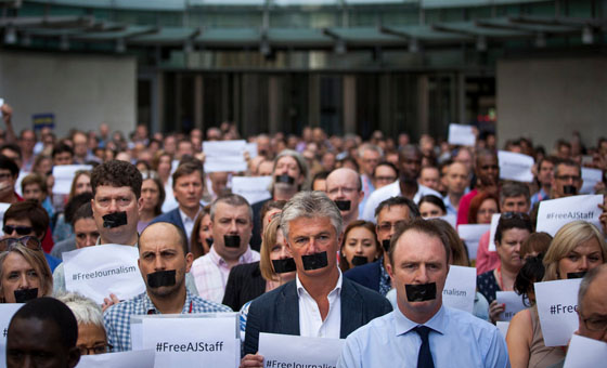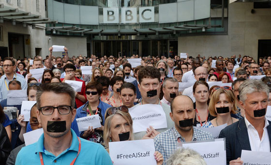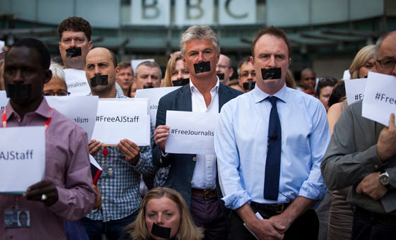当地时间2014年6月24日,英国伦敦,英国广播公司(BBC)的记者和其他工作人员用黑色胶布封住了自己的嘴,以表达对在埃及被判入狱的记者的支持,并抗议发生在全球范围内对言论自由和记者的迫害。埃及法庭于当地时间周一宣判三名半岛电视台记“协助已被取缔的穆兄会”罪名成立,判处其监禁七年。