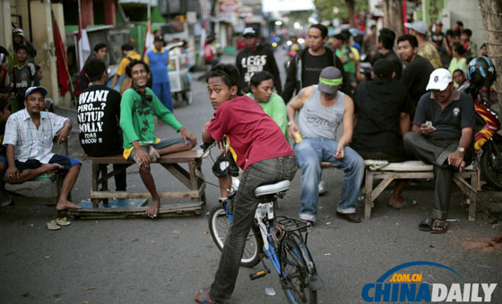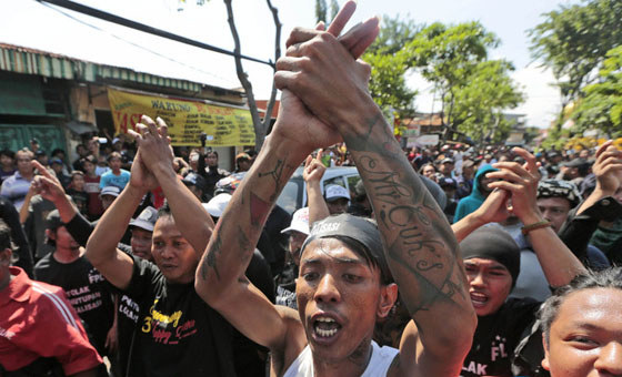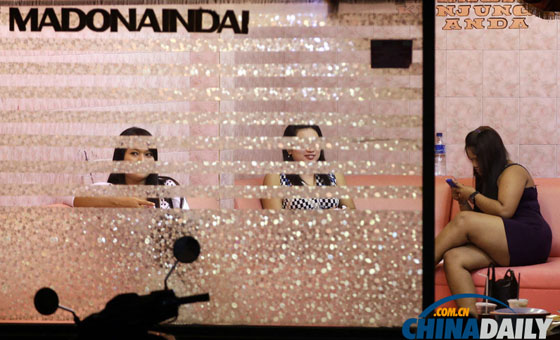 当地时间2014年6月19日,印尼泗水,一名卡拉OK女孩高呼口号,抗议政府关闭多莉红灯区。印尼第二大城市泗水市的市长丽斯玛上周宣布关闭东南亚最大的红灯区之一,但当地的妓院不顾警告,仍继续营业。