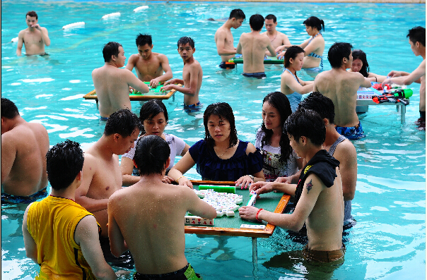 广东三水九道谷举办首届水上麻将大赛 。 6月24日下午,广东三水九道谷景区举办了首届水上麻将大赛,吸引上百雀友前来参战,他们泡在清凉的游泳池里,大战三百回合,同时享受水下的清凉与麻将带来的快乐。