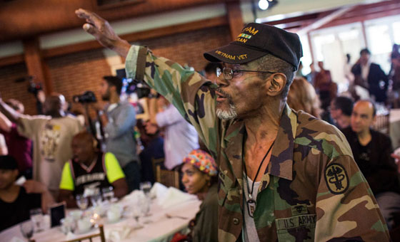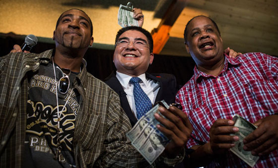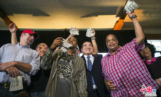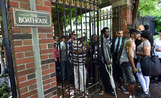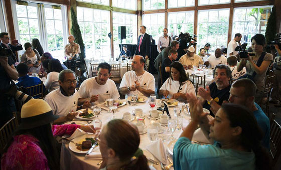 中国网6月26日讯 当地时间2014年6月25日,吵着沸沸扬扬的标哥宴请纽约流浪汉的活动终于在纽约中央公园的船坞酒店举行。一早美国各大媒体的记者就赶到现场等待陈光标的出现。而赶往赴约的纽约流浪汉们更是早早就围坐在餐桌旁。记者在场看到他们中绝大多数人穿着整齐,而餐桌上的食物看起来也诱人可口。