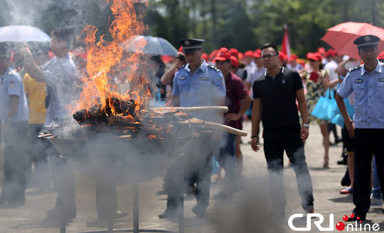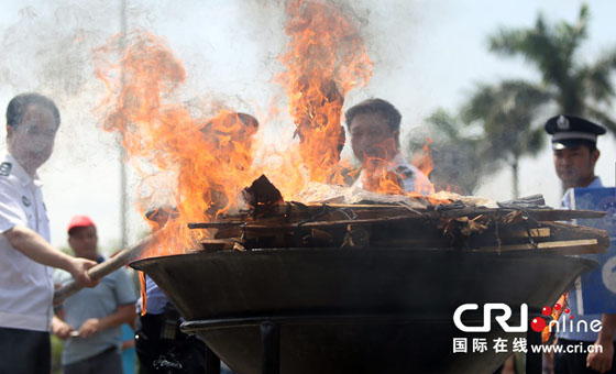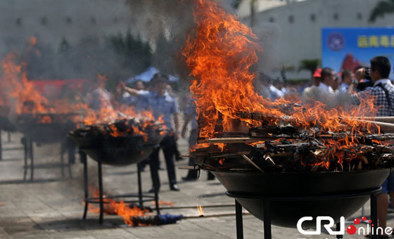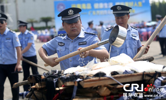 2014年6月26日是国际禁毒日,广东省禁毒委在东莞市虎门镇举行大型销毁毒品现场活动,公开销毁包括100公斤K粉、125公斤冰毒、17公斤海洛因在内的240公斤的毒品。图为毒品销毁现场 图片来源:中国日报亚洲新闻图片网/陈帆