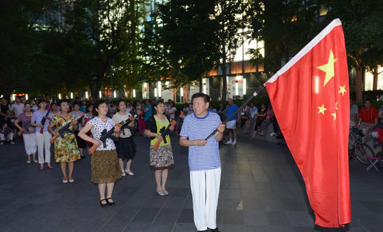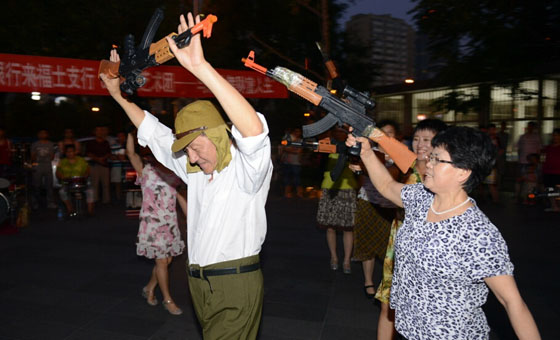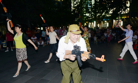 2014年6月27日消息,北京,近日,一群手持玩具枪的大妈们,在东直门某购物商场前上演“打鬼子”的好戏。她们人手一支玩具AK47步枪,时而列队行进,时而挥舞步枪。图为2014年6月27日,北京东直门,大妈街头持枪跳舞。