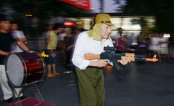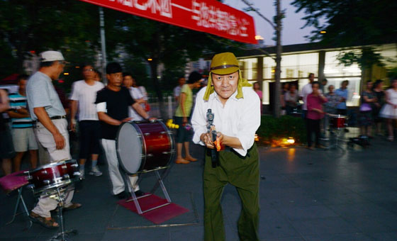 图为2014年6月27日,北京东直门,扮演“日本鬼子”的大爷上场。