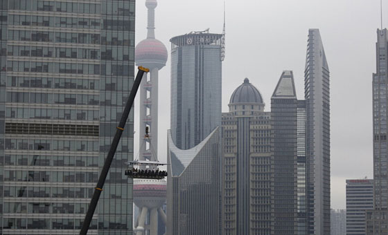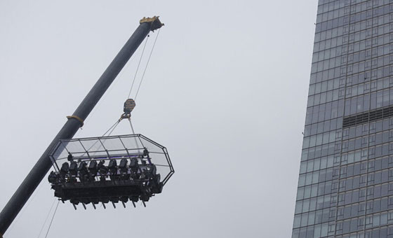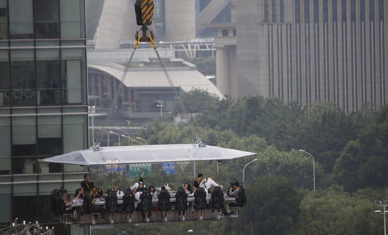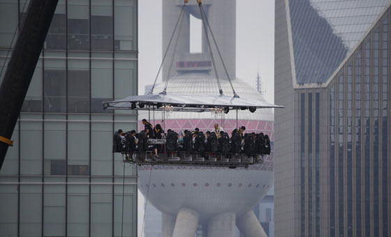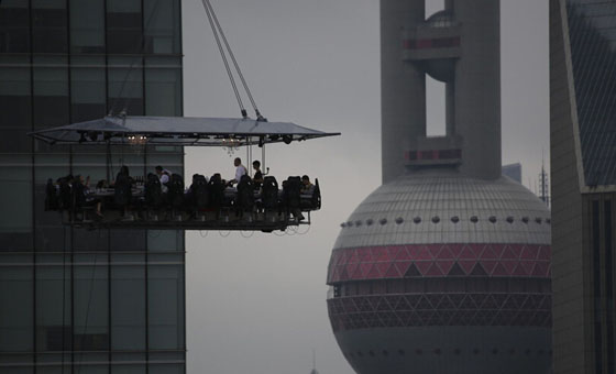 在50米高空露天悬空吃饭是什么感觉?曾经在世界多个国家出现的“空中餐桌”今天在上海陆家嘴“起飞”,虽然本该在昨天进行的上海首次“试飞”因遭遇梅雨季中的暴雨天而夭折,但6月27日上午,这张餐桌终于满载食客升空,围观者惊呼:“真是用生命在吃饭!”