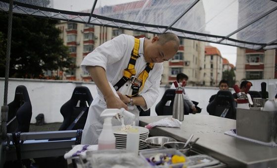 记者看到菜单,这其中包括了“红甜椒慕斯配番茄和黄瓜、海鲈鱼挞挞配蘘荷伴青柠汁、蟹肉提拉米苏配桃子泥伴生姜”三道菜,并有专门的侍者服务。本次的主厨来自四季酒店,他曾在法国巴黎的空中餐厅工作过。记者看到,所有的侍者、厨师的安全措施都“武装到牙齿”,在白色的厨师服外,都穿上了类似蹦极时所穿的保护装置。在惊叹声中,餐桌上天。据悉,享受这样一次餐饮服务的代价从1888元到8888元不等,主办方介绍,待到9-10月份时,这个空中餐桌项目还将再次来到上海。