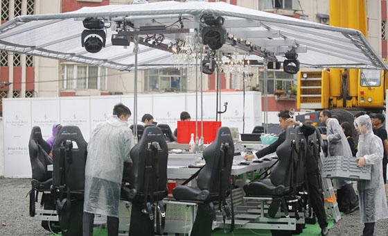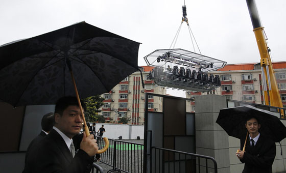 上午九点半,这张可以服务22位顾客的餐桌在细雨中缓缓升空。餐桌被一辆巨大的吊车牵引,放置于浦东四季酒店的室外停车场内,所有的食客都必须通过保险带牢牢捆绑在椅子上,细碎的小物件也被要求暂时寄放在地面,为保证餐具即使掉落也不会伤到旁人,吊车、餐桌区域被清场。首次升空的时间大约在50分钟,其中包括升降的时间。
