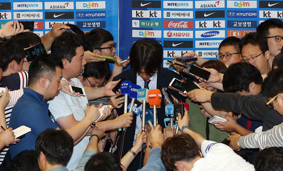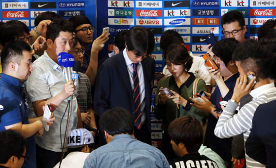 主教练洪明甫在机场举行记者会表示,韩国国民在世界杯期间为韩国队激情助威,但国家队没有取得理想的成绩,对此深感抱歉。