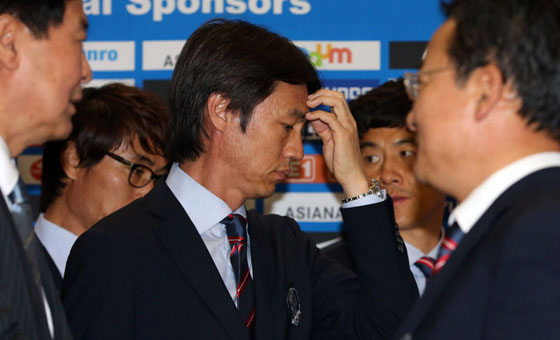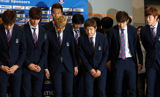 当地时间2014年6月30日,韩国首尔,韩国队飞抵仁川机场。由于本届世界杯成绩不佳,主帅洪明甫在记者面前鞠躬道歉。韩国三战一平两负,失6球,进3球。
