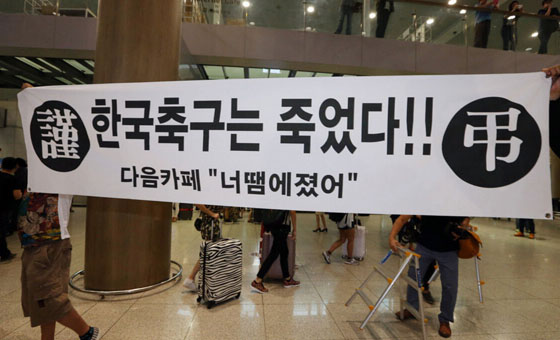 球迷举着“韩国足球已死”的标语讽刺太极虎将士。