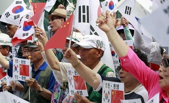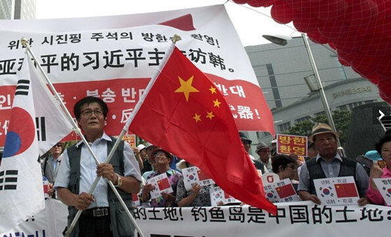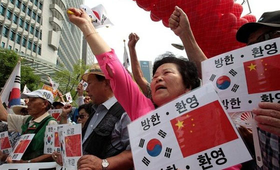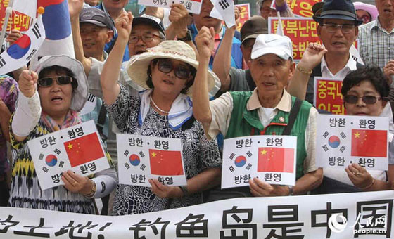 当地时间7月2日,在中国驻韩使馆前,韩国民众集会欢迎中国国家主席习近平访韩,并打出写有“钓鱼岛是中国的土地”字样。应韩国总统朴槿惠邀请,中国国家主席习近平将于7月3日至4日对韩国进行国事访问。这是习近平就任国家主席后对韩国的首次访问,也是首次专程访问一个国家。在日本安倍政府通过解禁集体自卫权的内阁决议案后,中韩两国的互动格外引人注目。