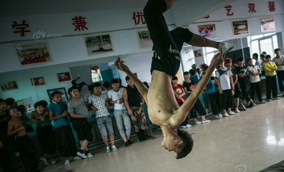 这些在学校的孩子每天要从早到晚的训练。早晨五点起来到晚上九点,要练习翻跟头、打把势、丢手绢、打快板和说学逗唱。到了晚上又要开始模拟演绎二人转的表演形式。这些都需要不断的重复练习。