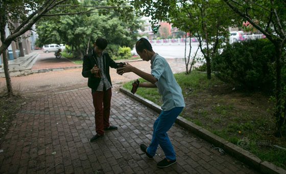 午饭后,两个孩子在学校外练习打快板。嘴里念念有词地说着自己编的段子,段子的内容多来自他们的生活,什么有意思,就琢磨怎么加进表演里。