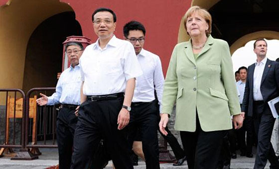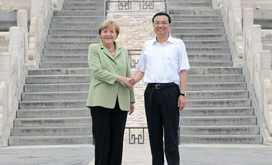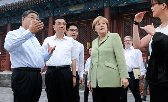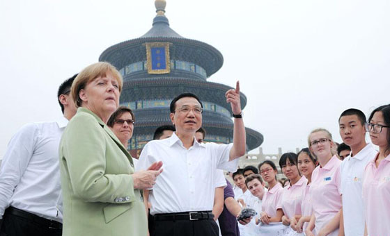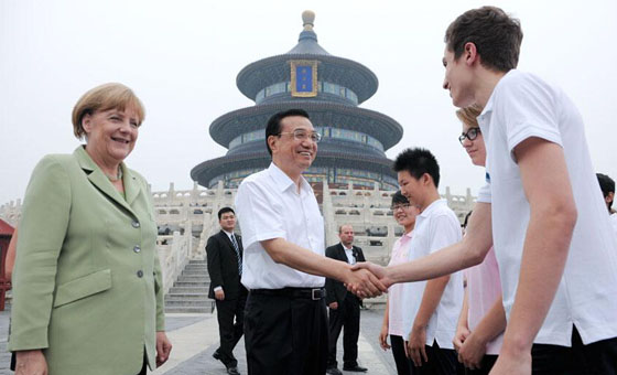 7月7日,中国国务院总理李克强陪同德国总理默克尔参观了北京天坛公园,并与近百名出席中德语言年闭幕式的两国青少年交流。两国总理询问了孩子们学习对方语言文化的感受,鼓励他们好好学习,做中德友好的小使者。随后,两国总理参观了祈年殿,并在公园里并肩散步。中新社