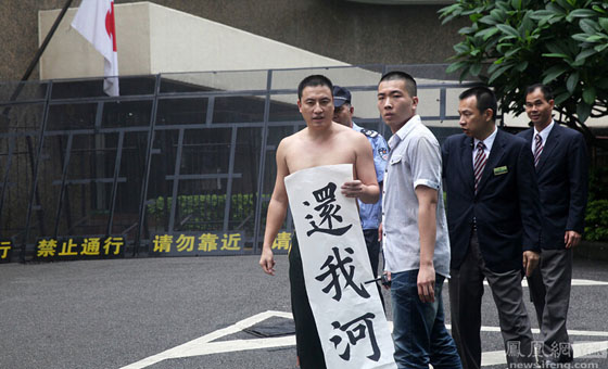 刘强原本穿着一套从广州战士歌舞团订做的07式军礼服(它的现实功用,是“新四军后代合唱团演出礼服”),此刻身上剩的一件白衬衫被广州6月份的天气溻湿了贴在脊背上,隐隐透出一周前刚刚文上去的“精忠报国”四个字。20分钟前,他刚刚脱光了上衣,在花园酒店的门前展示了这件新作,以及其他几幅写在宣纸上的书法作品——“日本谢罪”、“中华崛起”。此前还有几次,他边展示边唱歌,边用手指向斜插在不远处的日本国旗——偶尔还会做出手枪的手形。