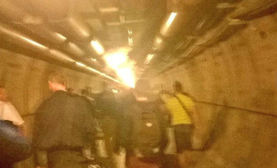 英法海底隧道地铁发生电力故障,乘客等待救援时在现场自拍。