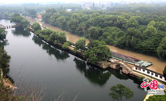 2014年7月7日中午,许多游客们正在风景如画的浙江绍兴市东湖风景区内游览美景。从高处向外眺望,一墙之隔的浙东古运河,由于被上游洪水污染而呈黄色,但是墙内的东湖水却是黛青色,水质清澈,鱼翔浅底。两者形成明显反差。