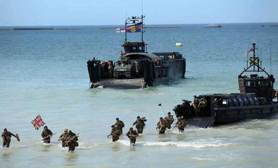 图为皇家海军陆战队重演登陆黄金海滩的一刻。诺曼底战役是到目前为止世界上最大的一次海上登陆作战,牵涉接近三百万士兵渡过英吉利海峡前往法国诺曼底。