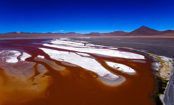 红湖:玻利维亚西南部(接近与智利的边界处)有一片红白相间的浅滩咸水湖,这就是著名的红湖。又叫科罗拉达湖。主要由于湖水含有红色矿物质,因此从远处往湖望去,会看到湖水一片红色。位于湖中的硼砂组成白色小岛屿,散布在富含红色藻类红色的湖面上,构成一道美丽的风景线。为红色藻类加灰白硼砂的双色湖。