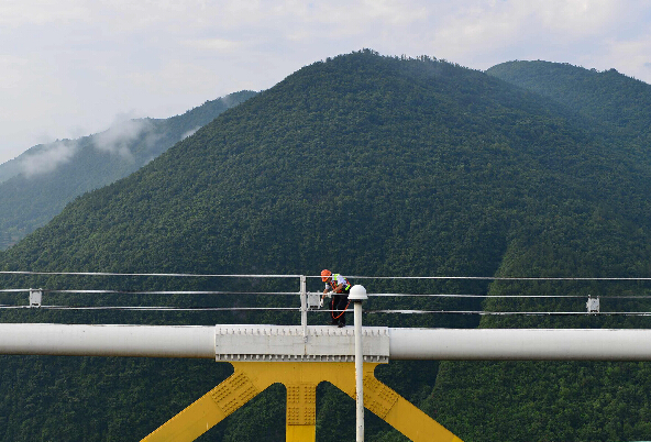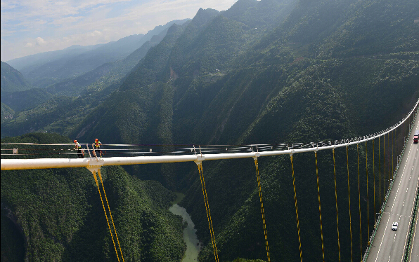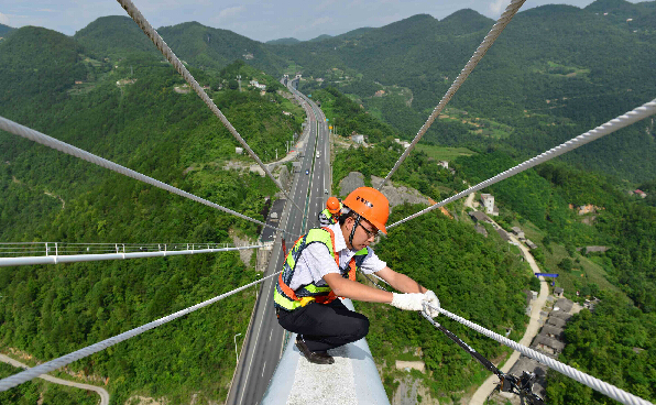 峡谷山风大、云雾多、谷底深,为保证大桥安全及相关设备的稳定运行,鄂西高速公路管理处第二养护站的两名90后养护工王勇和梁亚雄,常常需要爬上大桥两端锁塔之间的缆索(俗称“猫道”),查看一根根缆索、一处处防腐层、一个个螺栓是否有损伤,相关设备是否保养正常,确保大桥安全稳固。