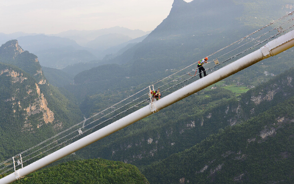 寒来暑往,两人穿梭在狭窄的“猫道”三年多,被人们称为美丽的“云端行者”。