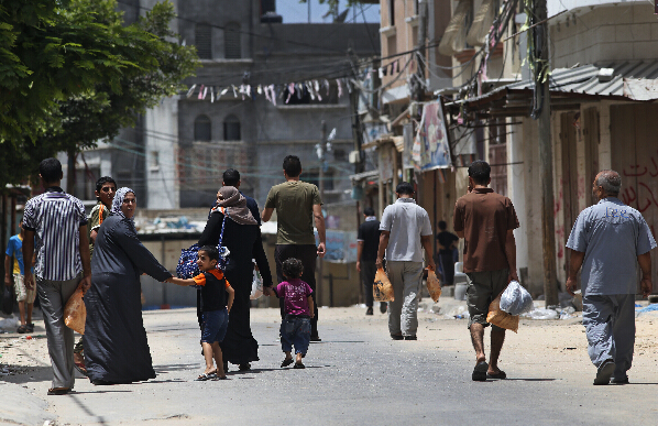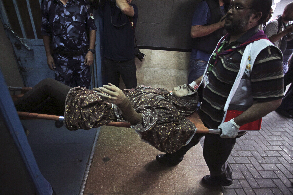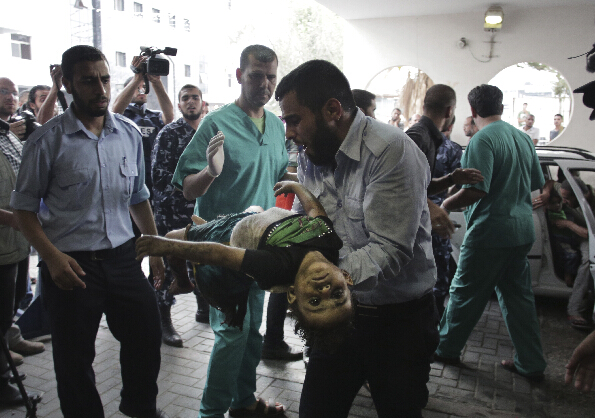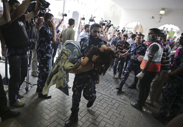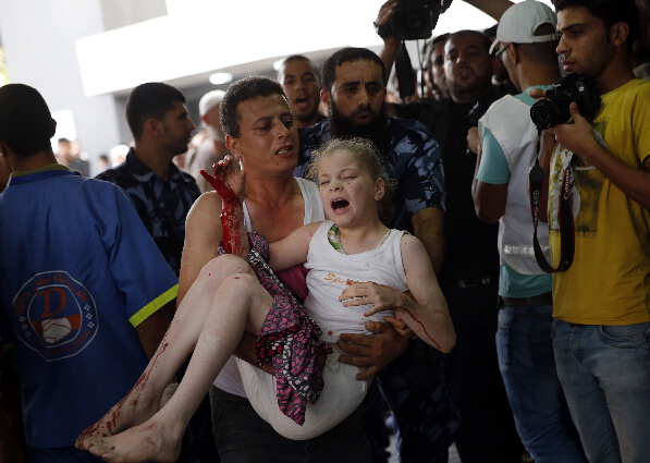 7月20日,在加沙地带一家医院,一名巴勒斯坦男子将一名受伤女孩抱至急诊室。