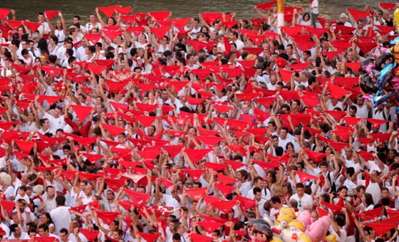 当地时间2014年7月23日,法国巴约讷,数千名狂欢者高举红色围巾参加当地举行的巴约讷狂欢节。巴约讷每年夏季都会举办狂欢节,为期五天的狂欢将涵盖美食、运动、文化、音乐会、奔牛、和游行等精彩内容。