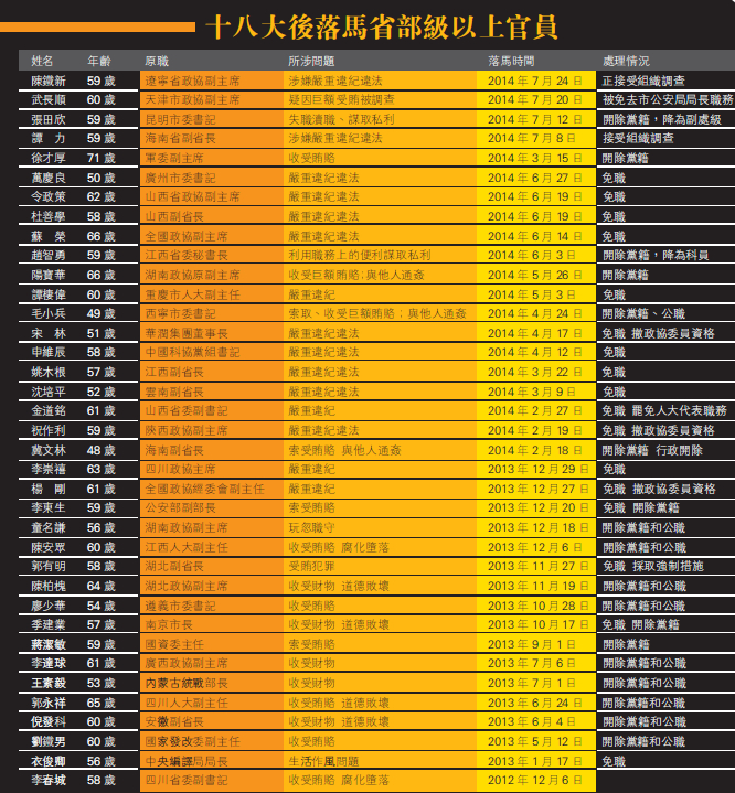 壯士斷腕習增威望 十八大以來,中共對腐敗分子的持續高壓態勢,受到海內外的高度關注,其反腐力度被輿論稱為「30年來最大」。新一屆領導人上任伊始便誓言「老虎」、「蒼蠅」一起打。進入2014年后,中國最高領導人習近平先后出席中央政法工作會議和中央紀委會議,對反腐敗再次放出重話。他指出,要以猛藥去、重典治亂的決心,以刮骨療毒、壯士斷腕的勇氣,堅決把黨風廉政建設和反腐敗斗爭進行到底。中央紀委交出的上半年的成績單,共有842名官員被查處。而隨著「大老虎」周永康案塵埃落定,以習近平為首的新一屆中央領導層在反腐上的累累碩果,收獲了民眾的一致好評和發自內心的掌聲。