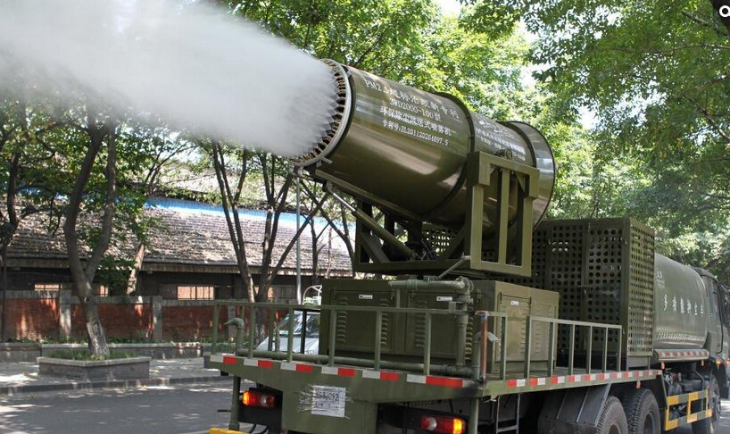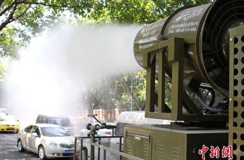 7月30日,重庆九龙坡区新华七村公路上,一辆外形酷似“大炮”的大型车辆喷出大量水雾降温。由于重庆夏天十分炎热,该市九龙坡区市政局购进了这款新型环保除尘风送式喷雾机,它最多能装5吨水,可连续工作5小时,主要目的是降尘降温,“炮筒”能360度随意旋转,最远能喷洒到100米。