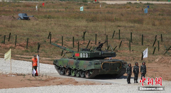 8月4日,俄罗斯“坦克两项-2014”国际竞赛在莫斯科郊区阿拉比诺靶场拉开帷幕。中国队坦克手当天驾驶国产96A型坦克,以绿色迷彩配红色国旗亮相。在当天午间进行的对坦克目标、直升机目标、反坦克榴弹发射器目标等的射击项目中,中国队全部命中目标。图为中国参赛坦克和坦克手首日亮相、待发。 中新社发 贾靖峰 摄