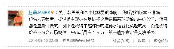 针对这一事件,著名足球记者赵震在微博上写道:“关于郭美美和某中超球员的事啊,我听说的版本不准确,但供大家参考。据说是有球迷在足协杯之后恶搞某球员编出来的段子,信息都是量身订做的。倒不是觉得中超球员的道德水准就比英超的高,而是觉得价格不符合市场规律,中超球员有15万,第一选择肯定是买块手表。”