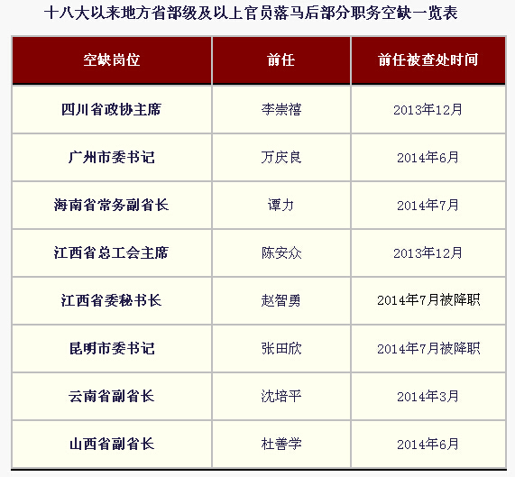 目前的副省部级正职(或唯一副职)需补岗位有4个:分别是广州市委书记(万庆良于2014年6月被免职)、海南省常务副省长(谭力于2014年7月被查处)、江西省委秘书长(赵智勇于2014年7月被降职)、昆明市委书记(张田欣于2014年7月被降职)。这些职务的继任者尚未有官方消息披露,预计相应调整还将继续。