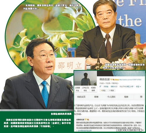 8月12日,湖南省纪委预防腐败室副主任陆群,通过其“御史在途”实名认证微博,举报原国家食药监局局长、现国家药典委常务副主任委员邵明立“为利益集团代言”。陆群称,2005年前後,国家药典委把中国南方地区传承上千年的“金怠花”更名为“山怠花”,并把金怠花作为邵明立老家山东“忍冬花”的专用名。更名後,南方金怠花价格一落千丈,“北方金怠花贩子趁机大量低价收购,冒充北方金怠花高价卖出,牟取暴利,致使南方花农血本无归”。