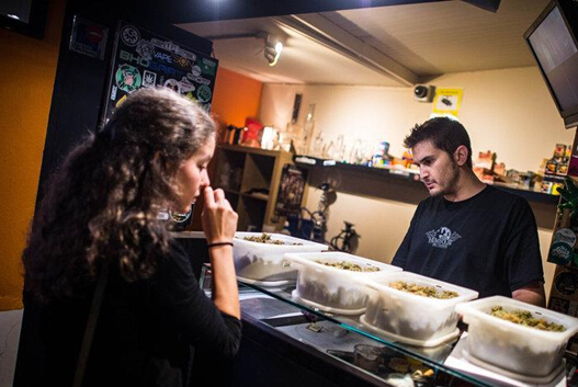 当地时间2014年8月22日,西班牙巴塞罗那,大麻俱乐部的员工向会员介绍不同类型的大麻。