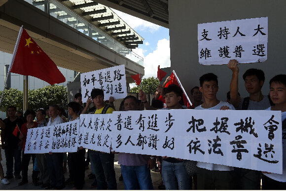 香港举行政制简介会 有市民在场外支持人大决定。 9月1日,《全国人大常委会关于香港特区行政长官普选问题和2016年立法会生成办法的决定》简介会在香港亚洲博览馆举行,图为有市民在会场外集会,支持全国人大常委会就香港政改问题作出决定。