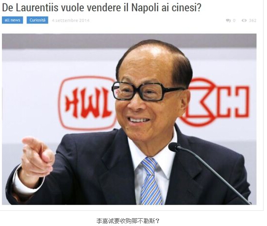 在相关报道中提到,德劳伦蒂斯可能把那不勒斯俱乐部卖到中国。德劳伦蒂斯有意出售那不勒斯,而接手的对象可能是中国富豪李嘉诚。在印尼商人托希尔购买国际米兰70%股权之前,李嘉诚曾有意从莫拉蒂手中收购这家意大利豪门俱乐部。现在该轮到那不勒斯了。德劳伦蒂斯将前往中国,在这期间,双方将举行会谈,商谈重要的事情。不过,意大利媒体显然低估了李嘉诚的财力,称他的财富高达188亿美元。其实,这是他在2006年的资产总额。