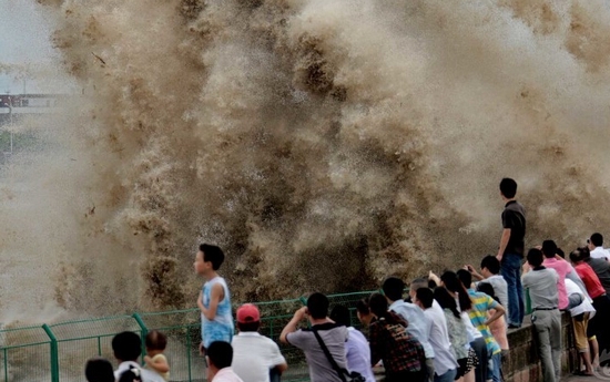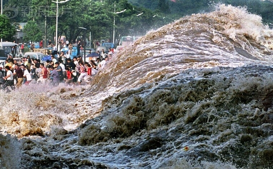 每到农历八月十八前后,有成千上万的人涌到钱塘江边看潮,场面远胜西班牙斗牛。图为2008年9月15日,数万中外游客在海宁盐官观看一线潮。摄影:王芯克/青年时报