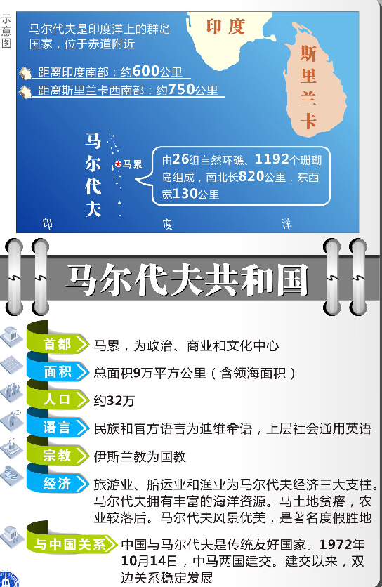 1972年,中马两国正式建立外交关系。40多年来,双方始终相互尊重、相互信任、相互支持,两国关系堪称大小国家平等相待、友好相处、互利合作的典范。近年来,中马各领域交往日益频繁,务实合作不断深化。双边贸易保持快速增长势头,旅游合作发展势头迅猛。中国连续4年成为马尔代夫最大游客来源国,马尔代夫成为中国民众特别是年轻人心目中度假胜地和浪漫天堂。中方为马尔代夫发展经济和改善民生提供了力所能及的支持。事实证明,中马两国不仅是真诚互信、互帮互助的朋友,更是携手发展、共同繁荣的伙伴。