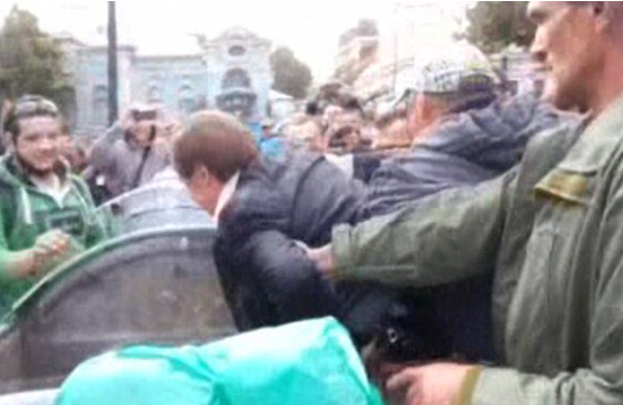 据英国每日邮报消息,乌克兰一名国会议员16日走出国会大楼时,突遭民众围堵,将他扔进装满垃圾的垃圾桶,数人还压着他的头,不让他有逃离的机会,接着朝他扔掷汽车轮胎,并在他身上洒不明液体,最后还抬着垃圾桶游街,直到警方到场才救出这名议员。