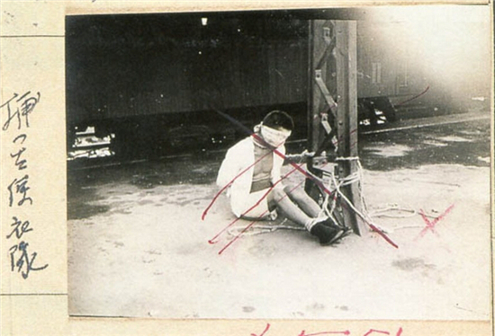 图为一名被捕的中国便衣被蒙住双眼,四肢捆绑在天津火车站的立柱旁。