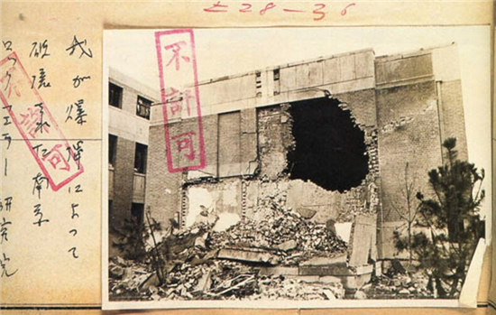 图为南京私立广东医院在空袭中被摧毁。大规模的轰炸造成大量非军事设施被摧毁和平民的伤亡,为了掩盖事实,与南京空袭相关的照片均为“不许可”照片。