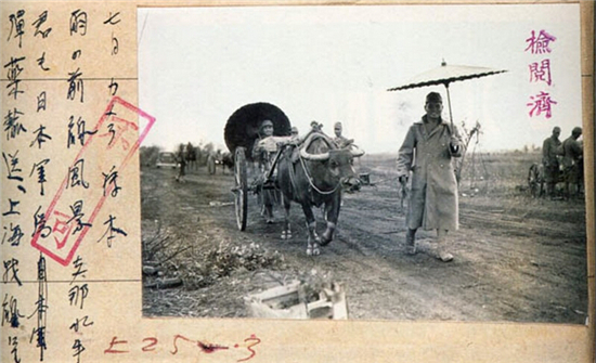 图为1937年10月,几名日军士兵用从中国老百姓那里抢来的牛车往前线运送弹药。这张照片起初盖上了“检阅济”的印章表示可以发表,但在之后的审查中被判为“不许可”照片。