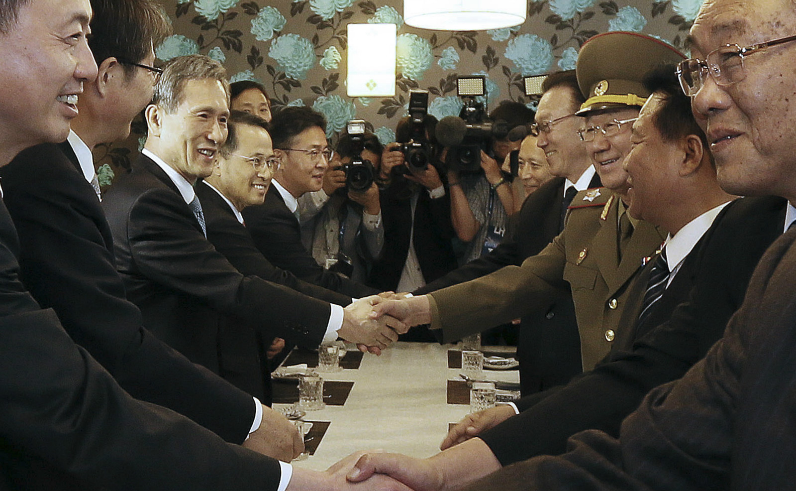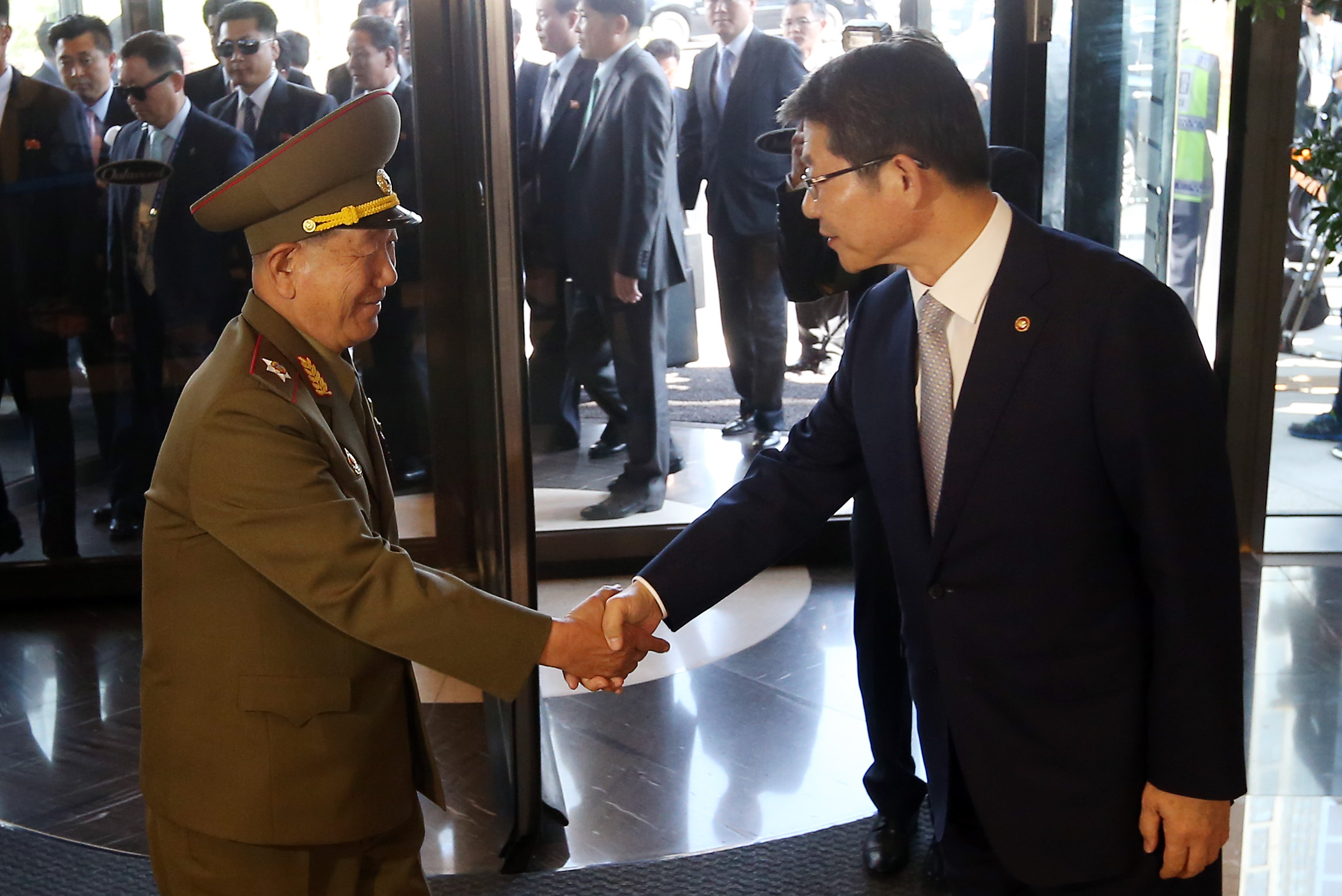 据新华社记者的描述,“11时,韩国统一部长官柳吉在等候在松岛橡树林酒店迎接朝鲜高级代表团,黄炳誓身着军装,崔龙海和金养健身着西装抵达后,双方互致问候,亲切握手。”