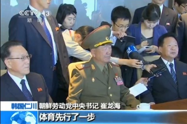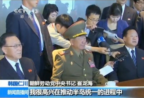 图为崔龙海在此次与韩方会谈上的表态,右侧身着西装者为崔龙海。